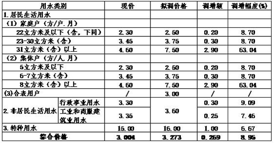 《方案》指出,通过对新增成本的因素考虑,并综合计算之后,深圳综合水价应为3.273元/立方米。据此,市发改委具体提出了两套阶梯水价调整方案,其综合价格均较原来上涨0.269元/立方米,增长幅度均为8.95%。调整范围涉及居民生活用水、非居民用水和特种用水3类。